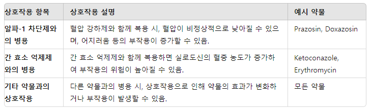 다른 약물과 병용 시 상호작용이 발생할 수 있으므로, 현재 복용 중인 모든 약물에 대해 의료 전문가와 상담하는 것이 중요합니다. 특히 알파-1 차단제나 간 효소 억제제와의 병용 시 주의가 필요합니다.