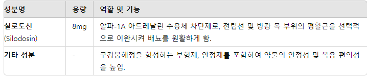 실로도신은 전립선 비대증으로 인한 배뇨장애를 개선하는 데 중요한 역할을 하며, 기타 성분은 약물의 효능을 안정적으로 유지하고 복용 편의성을 증대시킵니다.