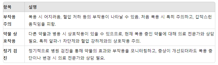 둘째, 다른 약물과 병용할 때는 상호작용이 있을 수 있으므로, 현재 복용 중인 모든 약물에 대해 의료 전문가와 상담해야 합니다. 특히 알파-1 차단제나 혈압 강하제와 함께 사용할 경우 상호작용의 위험이 커질 수 있습니다.