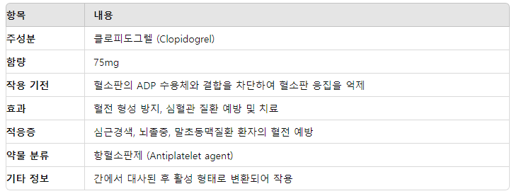 - 주성분: 클로피도그렐(Clopidogrel)로, 혈소판 응집을 억제하는 항혈소판제입니다.