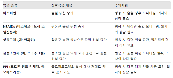 - NSAIDs: 비스테로이드성 소염진통제(NSAIDs)와 병용 시 위장관 출혈 위험이 증가하므로, 이러한 약물과의 병용은 신중하게 고려해야 하며, 위장관 출혈 여부를 모니터링해야 합니다.